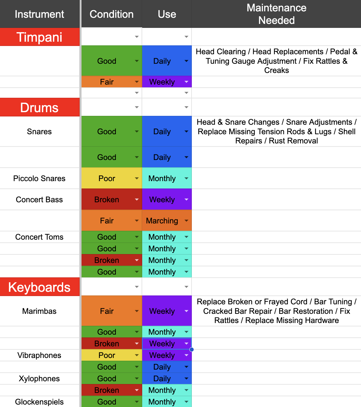 Use a maintenance log or digital tool to track when each piece of equipment was last serviced, what work was done, and when it should be checked again. This can be an Excel spreadsheet, a Google Calendar with recurring reminders, or even a simple poster in the percussion section. Bonus points if you can find a way to incorporate students into this process.