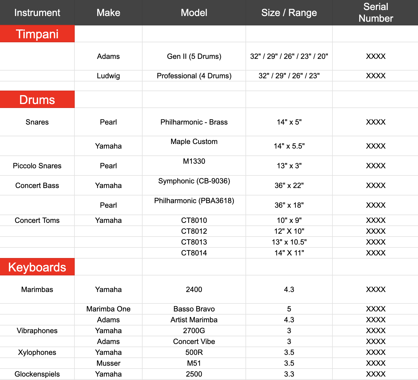 List all of your percussion equipment in the first column of your spreadsheet. We recommend grouping them by category so you can find them quickly.